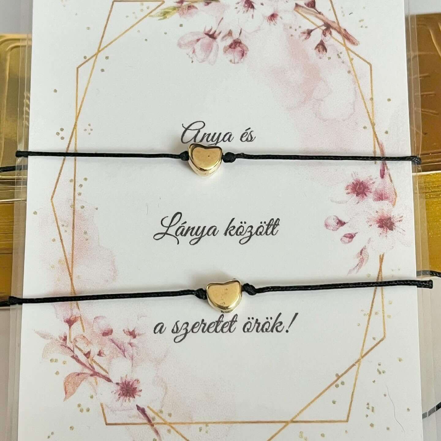 Egy-egy arany színű szívvel ellátott fonott pamut karkötő csúszó csomóval, így ajándéknak is tökéletes lehet, mivel a meglepett csuklóméretét nem kell pontosan tudnod.