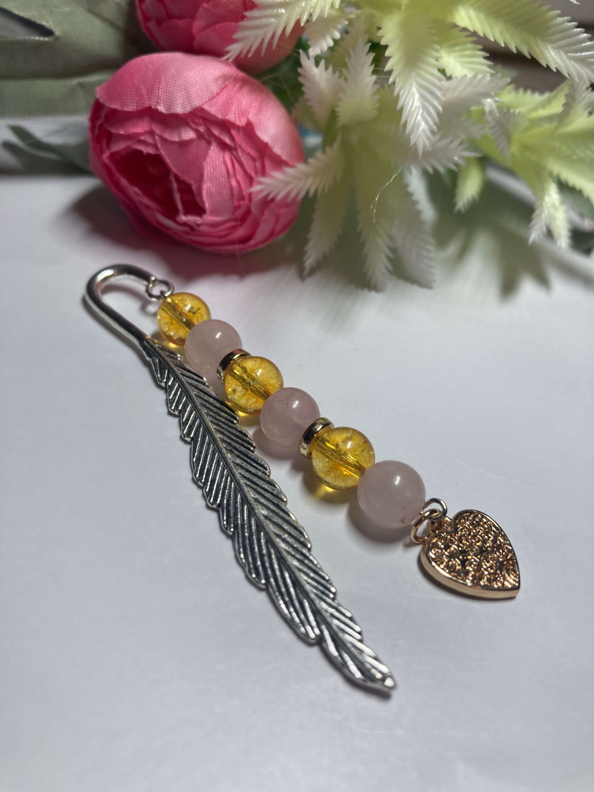 Sárga-rózsaszín ásványokból készült könyvjelző. Ásványai: rózsakvarc és citrin