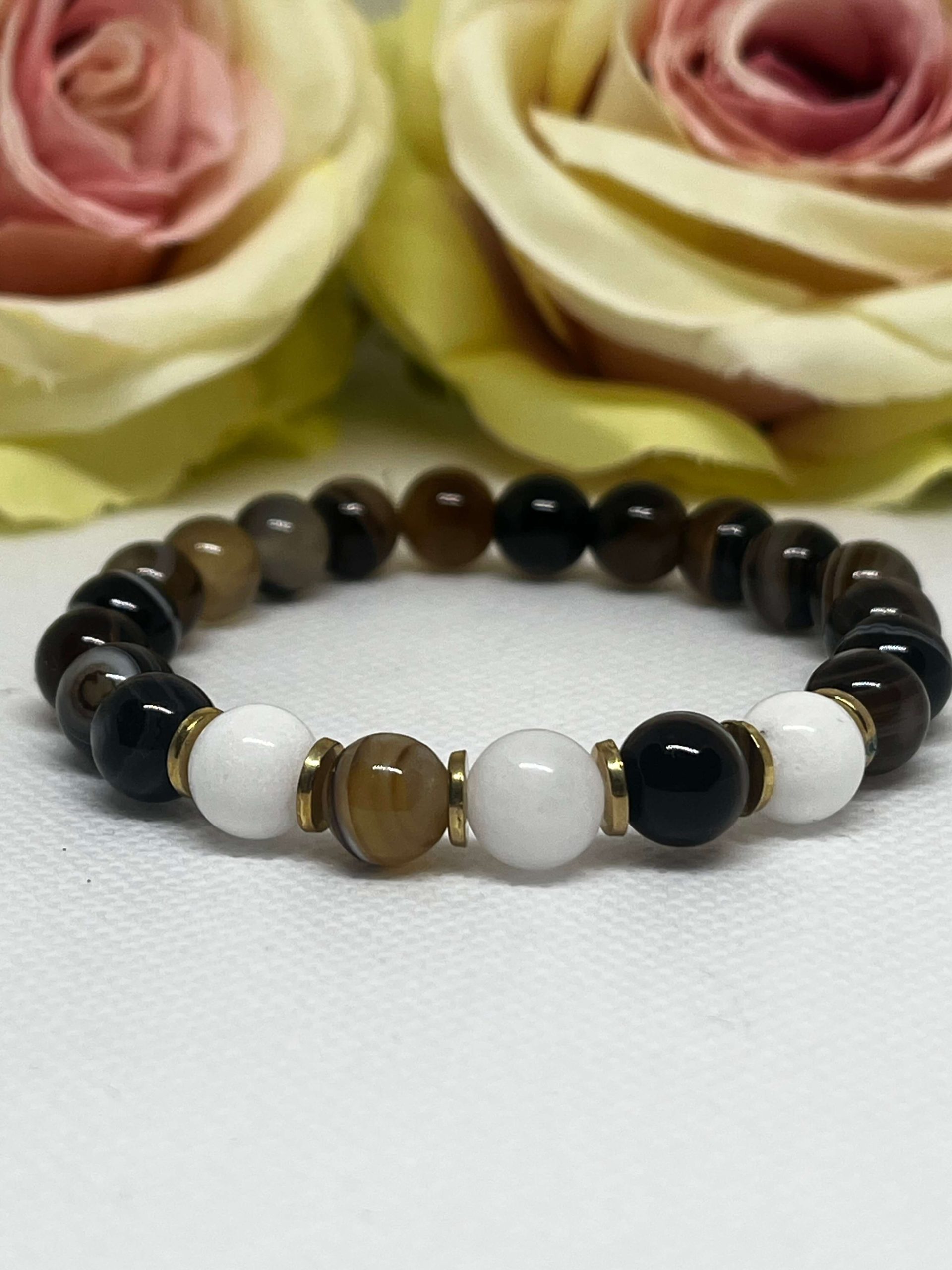 Barna sávos achát karkötő fehér jádéval