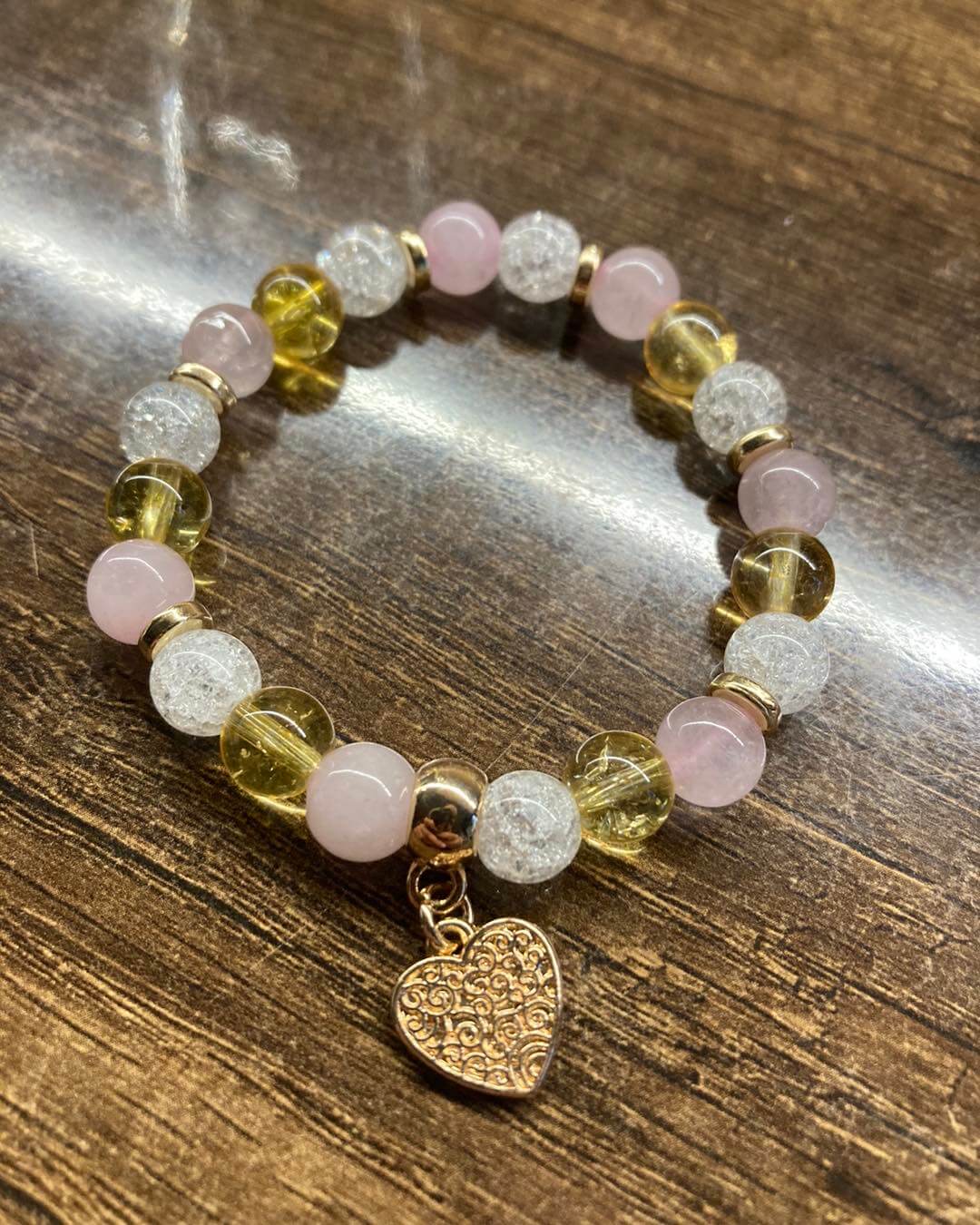 Citrin karkötő az önbecsölés és bőségért, egy apró aranyszínű szív medállal díszítve