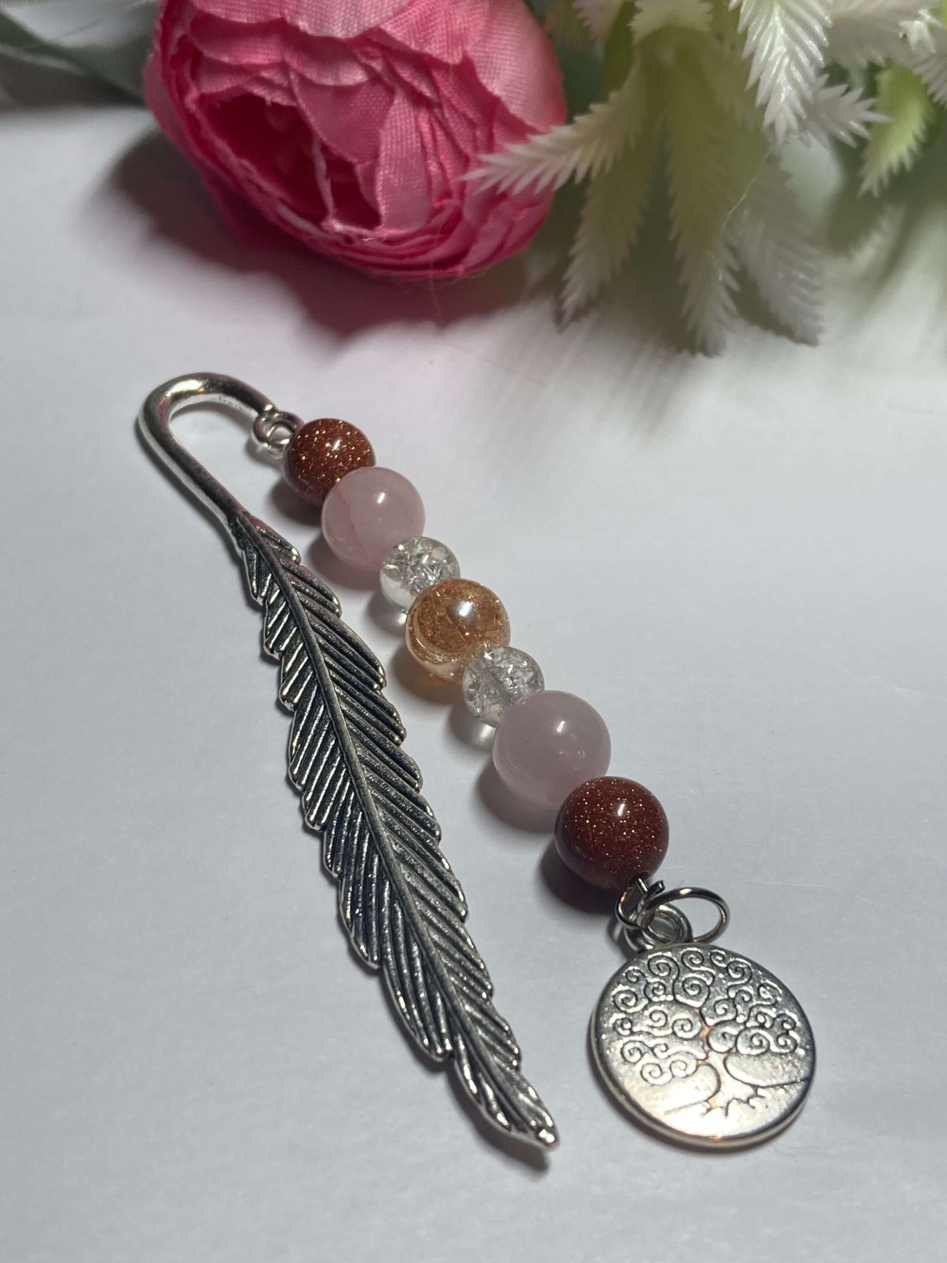 Rózsaszín-barna ásványokból készült könyvjelző. Ásványai: Goldfluss,rózsakvarc, aura és hegyikristály