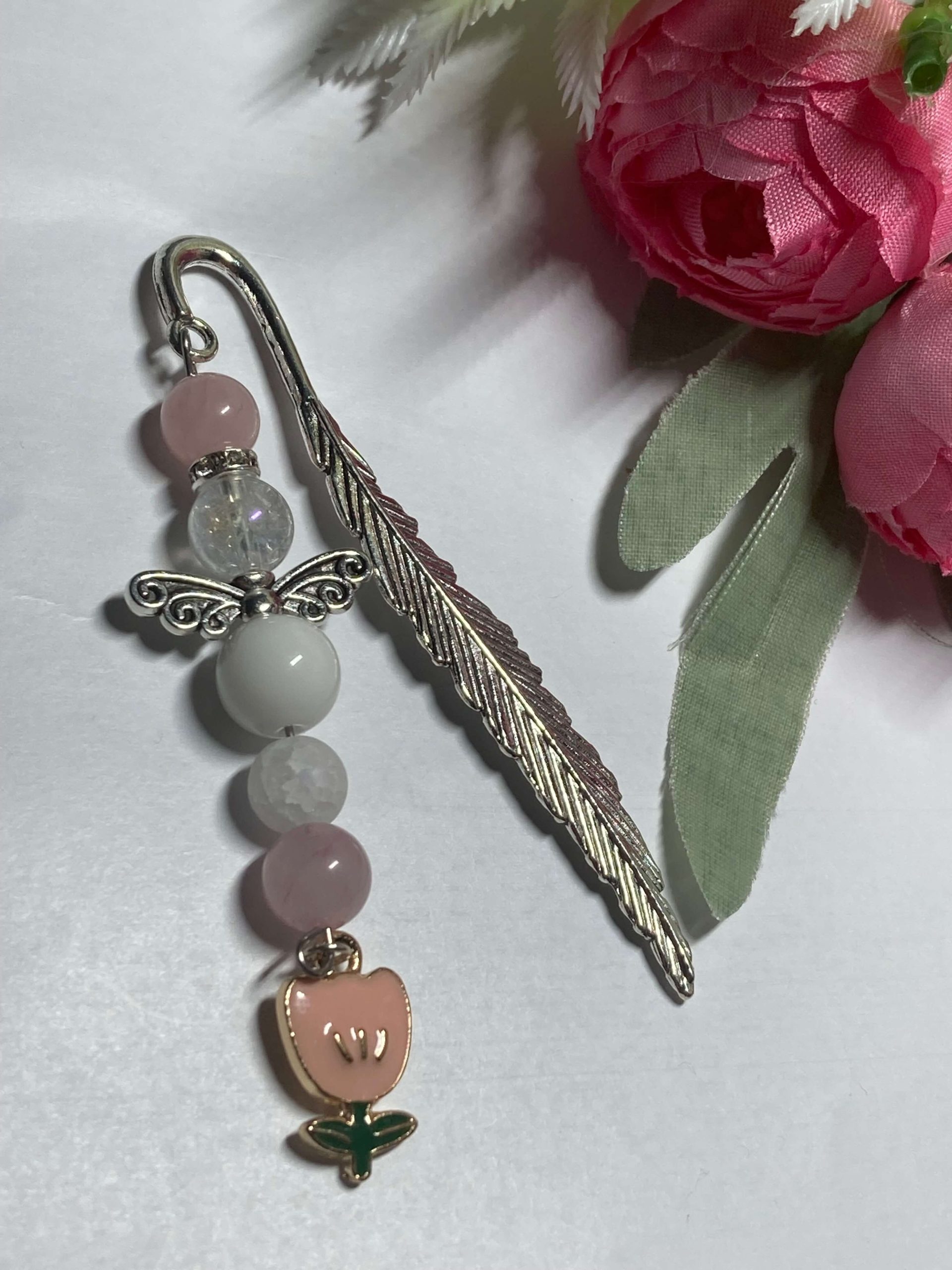 Rózsaszín-fehér ásványokból készült könyvjelző. Ásványai: jáde, hegyikristály és jáde